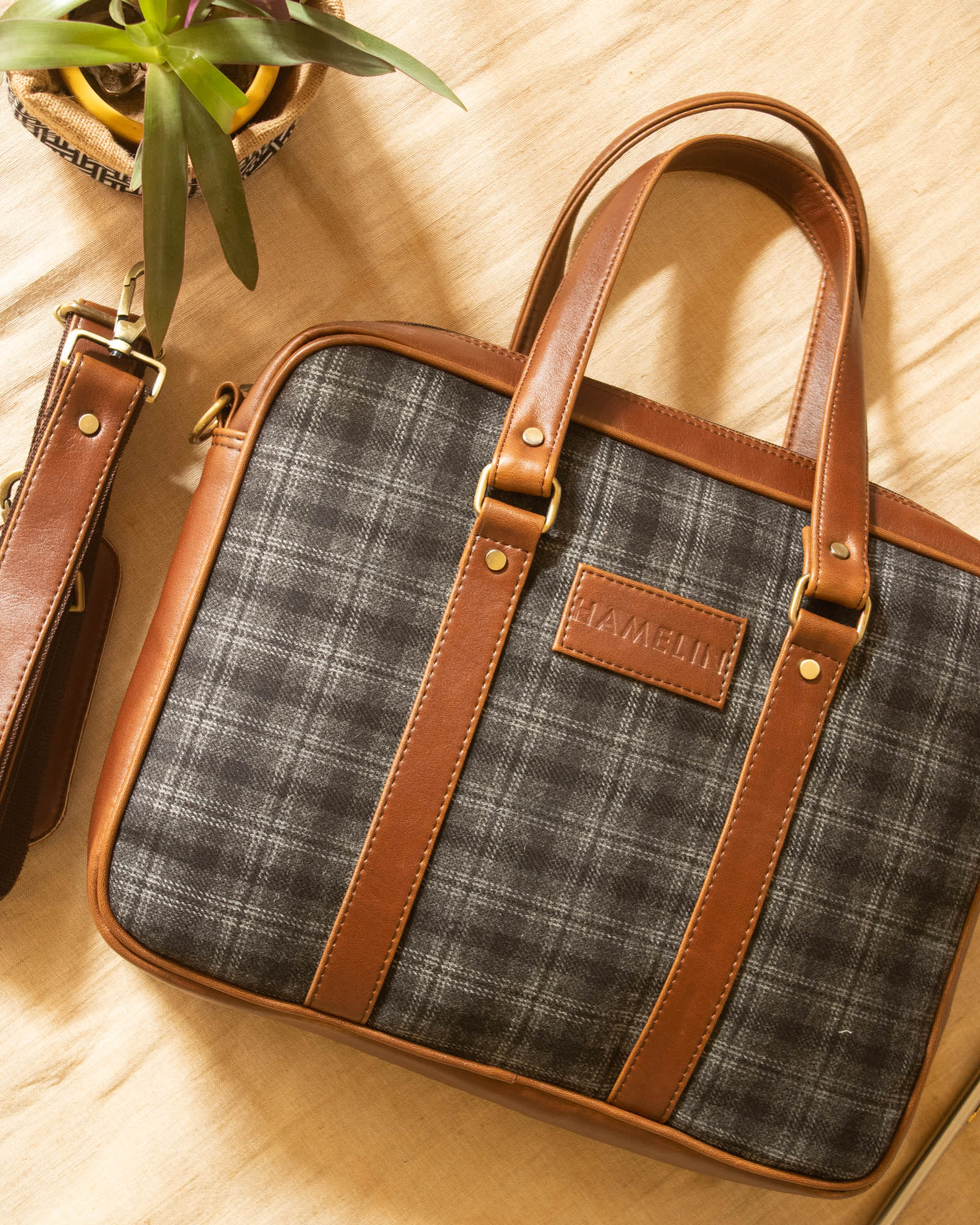 - Add some color to your work look, with these unique bags from Hamelin. Made with luxurious Tweed fabric and Vegan Leather, these bags are just what you need for a perfect day in office. It has enough room for your laptop, charger, iPad, Notepad, pens, mobile phones and more!