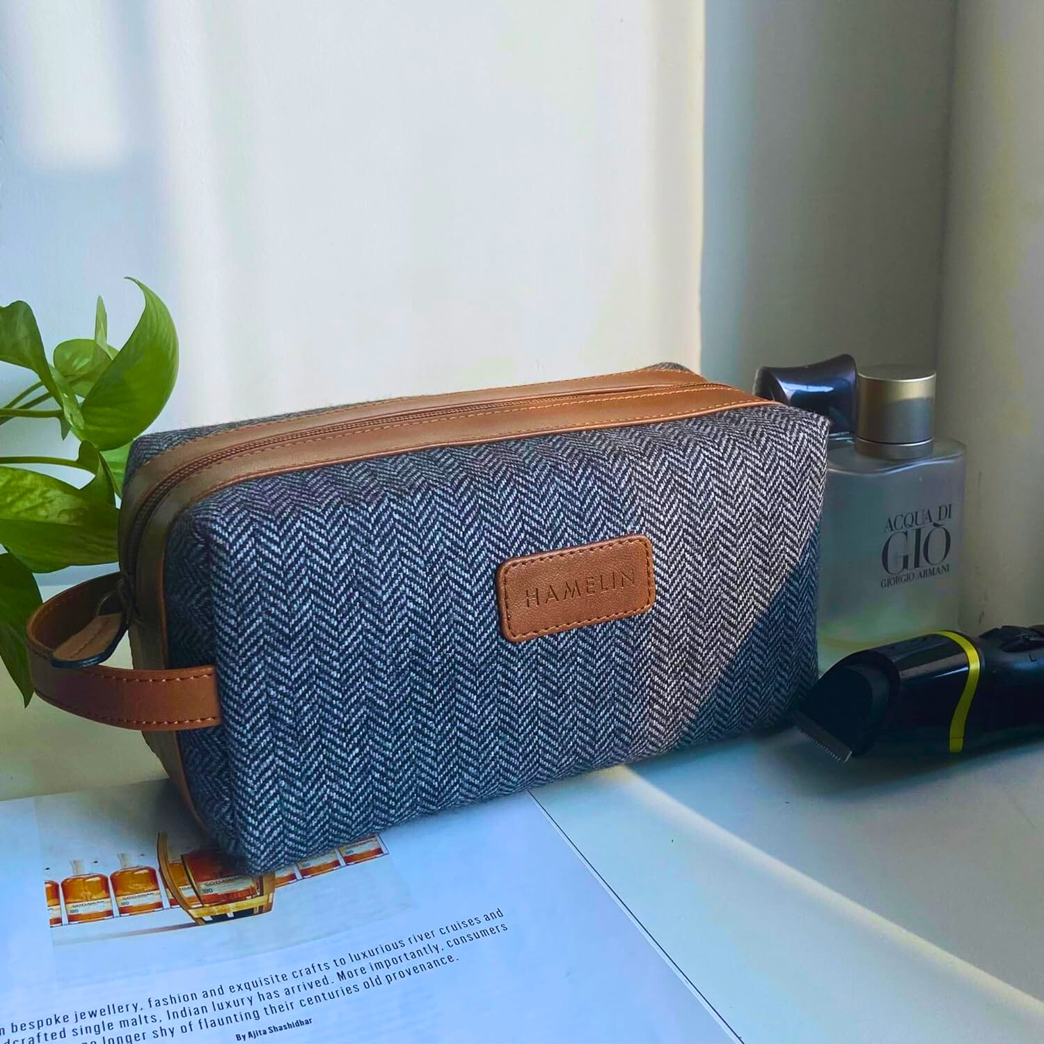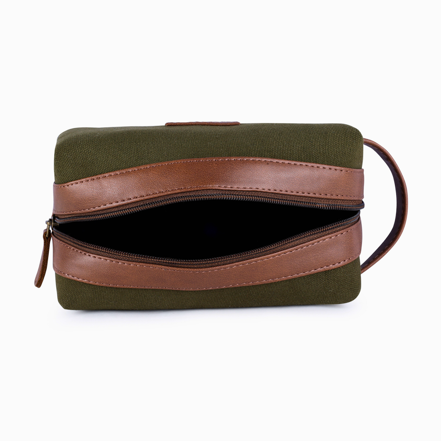 Canvas and vegan leather toiletry kit, or DOPP kit, perfect for anyone on the go.